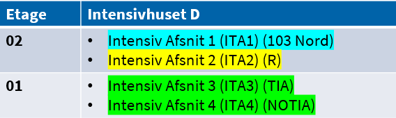 De intensiv afsnit samles i Intensivhuset D på niveau 01 og 02: