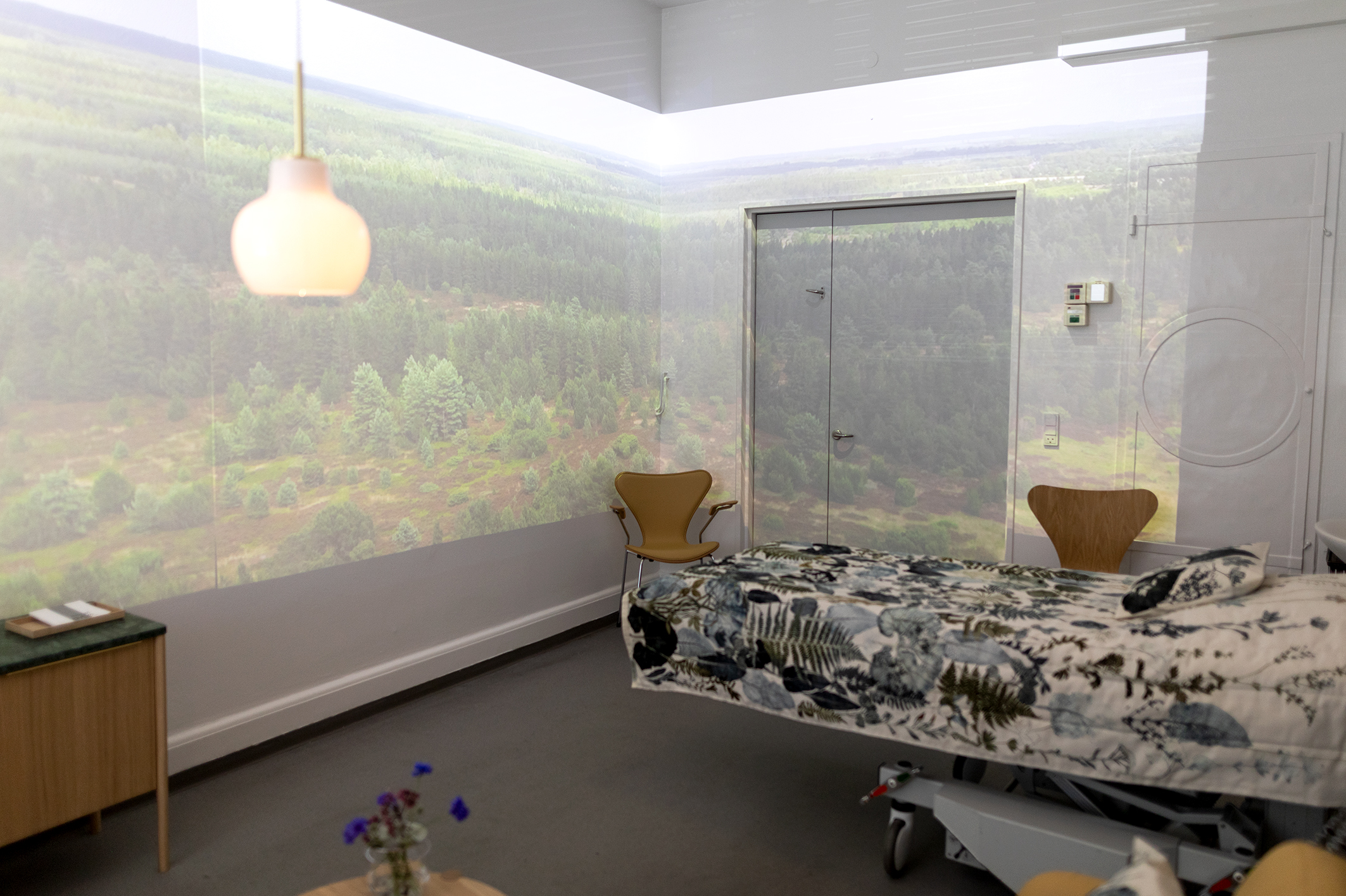 Hospitalsudstyret er gemt af vejen i store skabe, og der er installeret en projektor og et par højttalere på stuen, som gør det muligt for forældrene at vælge mellem 11 forskellige natursettings, der sender billeder og lyde ud på stuen.