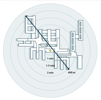Illustrationen nedenfor viser blandt andet, at afstanden mellem de to yderste punkter i den centrale Hospitalsbyen, det vil sige fra det yderste punkt i Akuthuset (A) og til yderste punkt i Ambulatoriehuset (M) kun er ca. 400 meter svarende til 2 minutters gang. Det er en afstand i fugleflugtslinje, der svarer til afstanden mellem Forskningens Hus (L) og Medicinerhuset på eksisterende matrikler i syd.