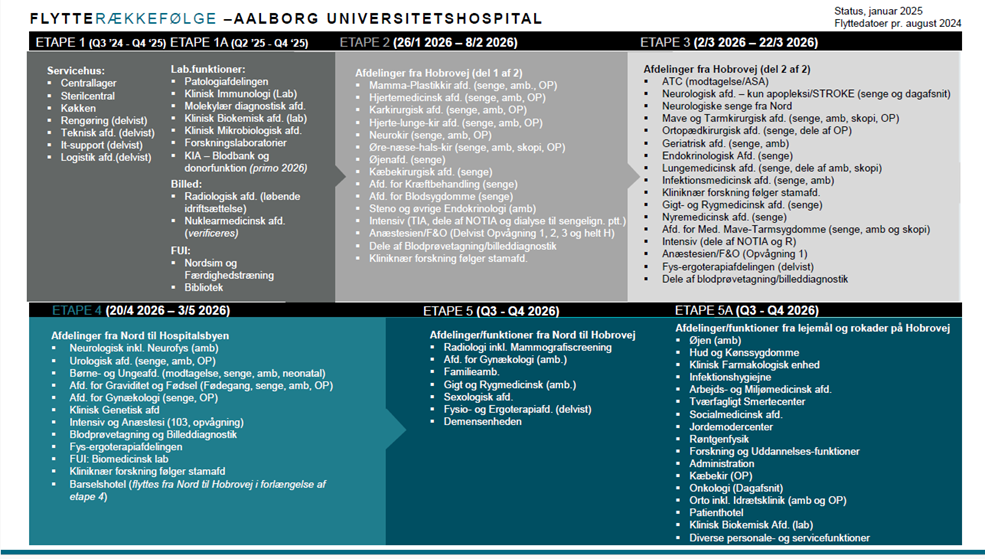 Flytningen af Aalborg UH og Psykiatrien bliver en af landets største hospitalsflytninger og er en af de største opgaver, Aalborg UH står over for. Det vil blive en flytning, som strækker sig over to år, fra de første til de sidste afdelinger flytter.