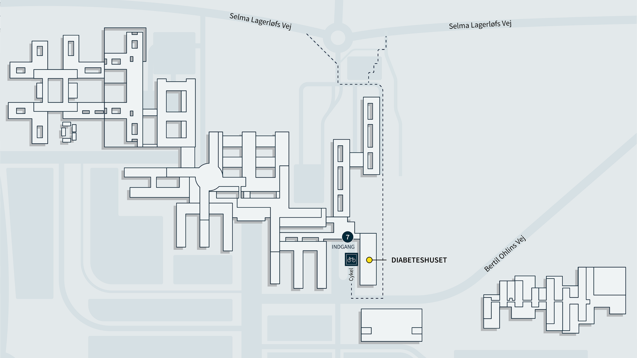 Når man kigger på Google Maps, ser det lige nu lidt kaotisk ud, men bare rolig. Der etableres et cykelstisystem omkring Hospitalsbyen, som kobles sammen med de eksisterende cykelstisystemer gennem universitetsområdet ved Selma Lagerløfs Vej. Tilsvarende etableres der cykelstier, så der er sammenhæng med omkringliggende byer, herunder Gistrup og Klarup.