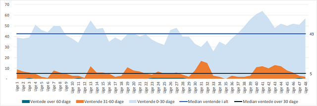De to diagrammer nedenfor viser det antal patienter, der ventende på udredning i henholdsvis 2017 og 2018. Farverne angiver hvor mange patienter der venter, og i hvor lang tid de har ventet. Bemærk at mængden af patienter der venter over 60 dage er næsten forsvundet i 2018 og at antallet af patienter der venter i 31 – 60 dage er mere end halveret.